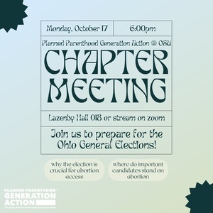 Join OSU Generation Action for a hybrid chapter meeting! Tune in at 6:00 pm on Zoom or head over to Lazenby Hall 018. We'll be discussing the upcoming Ohio General Elections, why they matter for abortion access, where candidates stand on abortion, and wrapping up the night with a repro trivia game!